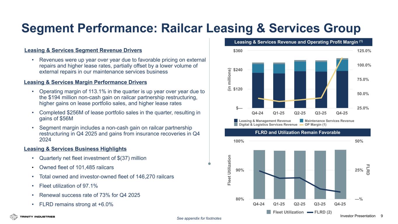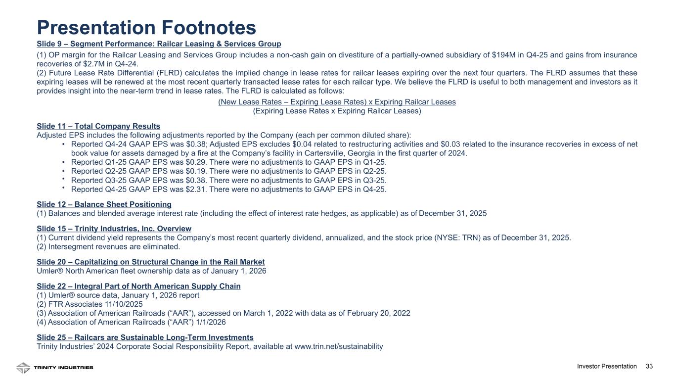 33Investor Presentation Slide 9 – Segment Performance: Railcar Leasing & Services Group (1) OP margin for the Railcar Leasing and Services Group includes a non-cash gain on divestiture of a partially-owned subsidiary of $194M in Q4-25 and gains from insurance recoveries of $2.7M in Q4-24. (2) Future Lease Rate Differential (FLRD) calculates the implied change in lease rates for railcar leases expiring over the next four quarters. The FLRD assumes that these expiring leases will be renewed at the most recent quarterly transacted lease rates for each railcar type. We believe the FLRD is useful to both management and investors as it provides insight into the near-term trend in lease rates. The FLRD is calculated as follows: (New Lease Rates – Expiring Lease Rates) x Expiring Railcar Leases (Expiring Lease Rates x Expiring Railcar Leases) Slide 11 – Total Company Results Adjusted EPS includes the following adjustments reported by the Company (each per common diluted share): • Reported Q4-24 GAAP EPS was $0.38; Adjusted EPS excludes $0.04 related to restructuring activities and $0.03 related to the insurance recoveries in excess of net book value for assets damaged by a fire at the Company’s facility in Cartersville, Georgia in the first quarter of 2024. • Reported Q1-25 GAAP EPS was $0.29. There were no adjustments to GAAP EPS in Q1-25. • Reported Q2-25 GAAP EPS was $0.19. There were no adjustments to GAAP EPS in Q2-25. • Reported Q3-25 GAAP EPS was $0.38. There were no adjustments to GAAP EPS in Q3-25. • Reported Q4-25 GAAP EPS was $2.31. There were no adjustments to GAAP EPS in Q4-25. Slide 12 – Balance Sheet Positioning (1) Balances and blended average interest rate (including the effect of interest rate hedges, as applicable) as of December 31, 2025 Slide 15 – Trinity Industries, Inc. Overview (1) Current dividend yield represents the Company’s most recent quarterly dividend, annualized, and the stock price (NYSE: TRN) as of December 31, 2025. (2) Intersegment revenues are eliminated. Slide 20 – Capitalizing on Structural Change in the Rail Market Umler® North American fleet ownership data as of January 1, 2026 Slide 22 – Integral Part of North American Supply Chain (1) Umler® source data, January 1, 2026 report (2) FTR Associates 11/10/2025 (3) Association of American Railroads (“AAR”), accessed on March 1, 2022 with data as of February 20, 2022 (4) Association of American Railroads (“AAR”) 1/1/2026 Slide 25 – Railcars are Sustainable Long-Term Investments Trinity Industries’ 2024 Corporate Social Responsibility Report, available at www.trin.net/sustainability Presentation Footnotes