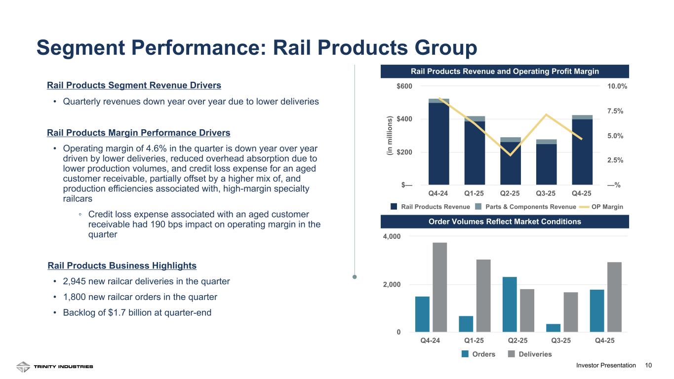 9Investor Presentation9 Leasing & Services Revenue and Operating Profit Margin (1) (in m ill io ns ) Leasing & Management Revenue Maintenance Services Revenue Digital & Logistics Services Revenue OP Margin (1) Q4-24 Q1-25 Q2-25 Q3-25 Q4-25 $— $120 $240 $360 25.0% 50.0% 75.0% 100.0% 125.0%Leasing & Services Segment Revenue Drivers • Revenues were up year over year due to favorable pricing on external repairs and higher lease rates, partially offset by a lower volume of external repairs in our maintenance services business Leasing & Services Margin Performance Drivers • Operating margin of 113.1% in the quarter is up year over year due to the $194 million non-cash gain on railcar partnership restructuring, higher gains on lease portfolio sales, and higher lease rates • Completed $256M of lease portfolio sales in the quarter, resulting in gains of $56M • Segment margin includes a non-cash gain on railcar partnership restructuring in Q4 2025 and gains from insurance recoveries in Q4 2024 Leasing & Services Business Highlights • Quarterly net fleet investment of $(37) million • Owned fleet of 101,485 railcars • Total owned and investor-owned fleet of 146,270 railcars • Fleet utilization of 97.1% • Renewal success rate of 73% for Q4 2025 • FLRD remains strong at +6.0% See appendix for footnotes Segment Performance: Railcar Leasing & Services Group Fl ee t U til iz at io n FLR D Fleet Utilization FLRD (2) Q4-24 Q1-25 Q2-25 Q3-25 Q4-25 80% 90% 100% —% 25% 50% FLRD and Utilization Remain Favorable
