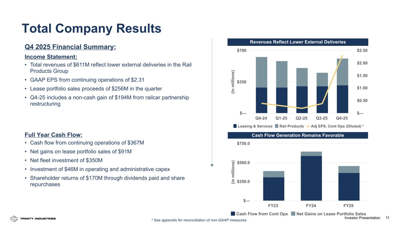 10Investor Presentation10 Rail Products Segment Revenue Drivers • Quarterly revenues down year over year due to lower deliveries Rail Products Margin Performance Drivers • Operating margin of 4.6% in the quarter is down year over year driven by lower deliveries, reduced overhead absorption due to lower production volumes, and credit loss expense for an aged customer receivable, partially offset by a higher mix of, and production efficiencies associated with, high-margin specialty railcars ◦ Credit loss expense associated with an aged customer receivable had 190 bps impact on operating margin in the quarter Rail Products Business Highlights • 2,945 new railcar deliveries in the quarter • 1,800 new railcar orders in the quarter • Backlog of $1.7 billion at quarter-end Rail Products Revenue and Operating Profit Margin (in m ill io ns ) Rail Products Revenue Parts & Components Revenue OP Margin Q4-24 Q1-25 Q2-25 Q3-25 Q4-25 $— $200 $400 $600 —% 2.5% 5.0% 7.5% 10.0% Segment Performance: Rail Products Group Orders Deliveries Q4-24 Q1-25 Q2-25 Q3-25 Q4-25 0 2,000 4,000 Order Volumes Reflect Market Conditions