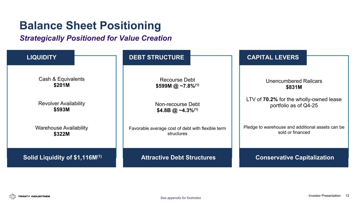 11Investor Presentation Revenues Reflect Lower External Deliveries Q4 2025 Financial Summary: Income Statement: • Total revenues of $611M reflect lower external deliveries in the Rail Products Group • GAAP EPS from continuing operations of $2.31 • Lease portfolio sales proceeds of $256M in the quarter • Q4-25 includes a non-cash gain of $194M from railcar partnership restructuring 11 Cash Flow Generation Remains Favorable * See appendix for reconciliation of non-GAAP measures (in m ill io ns ) Leasing & Services Rail Products Adj EPS, Cont Ops (Diluted) * Q4-24 Q1-25 Q2-25 Q3-25 Q4-25 $— $350 $700 $— $0.50 $1.00 $1.50 $2.00 $2.50 (in m ill io ns ) Cash Flow from Cont Ops Net Gains on Lease Portfolio Sales FY23 FY24 FY25 $— $250.0 $500.0 $750.0 Total Company Results Full Year Cash Flow: • Cash flow from continuing operations of $367M • Net gains on lease portfolio sales of $91M • Net fleet investment of $350M • Investment of $46M in operating and administrative capex • Shareholder returns of $170M through dividends paid and share repurchases