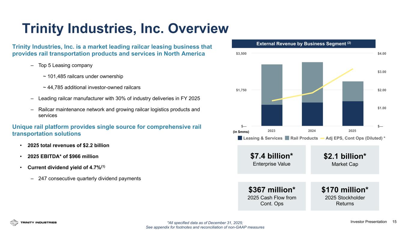 15Investor Presentation Trinity Industries, Inc. is a market leading railcar leasing business that provides rail transportation products and services in North America – Top 5 Leasing company ~ 101,485 railcars under ownership ~ 44,785 additional investor-owned railcars – Leading railcar manufacturer with 30% of industry deliveries in FY 2025 – Railcar maintenance network and growing railcar logistics products and services Unique rail platform provides single source for comprehensive rail transportation solutions • 2025 total revenues of $2.2 billion • 2025 EBITDA* of $966 million • Current dividend yield of 4.7%(1) – 247 consecutive quarterly dividend payments External Revenue by Business Segment (2) *All specified data as of December 31, 2025; See appendix for footnotes and reconciliation of non-GAAP measures $7.4 billion* Enterprise Value $170 million* 2025 Stockholder Returns $367 million* 2025 Cash Flow from Cont. Ops $2.1 billion* Market Cap Leasing & Services Rail Products Adj EPS, Cont Ops (Diluted) * 2023 2024 2025 $— $1,750 $3,500 $— $1.00 $2.00 $3.00 $4.00 (in $mms) Trinity Industries, Inc. Overview