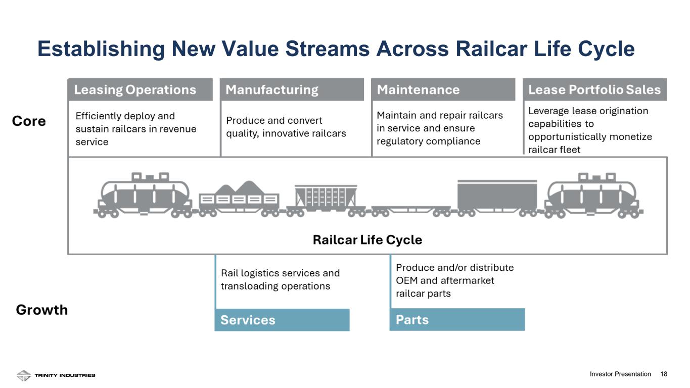 17Investor Presentation Platform Capabilities Support Optimized Lease Fleet Returns Lease Originations Captive Maintenance Parts and Services Manufacturing excellence and new product development Market data and leading market view Asset Management / RIV Partnerships Dual role as owner and builder creates a feedback loop reinforcing asset differentiation Complementary lines of business give us a broad industry view and early visibility to industry trends Lease origination capabilities give customer flexibility and unlock multiple monetization options for each asset Fee income from Rail Investment Vehicle partnerships worth an average of 100bp to Adjusted ROE over last 5 years Captive maintenance and Mobile Repair Units allow for more time on rent Parts and services reduce cyclicality of earnings stream and enhance customer experience