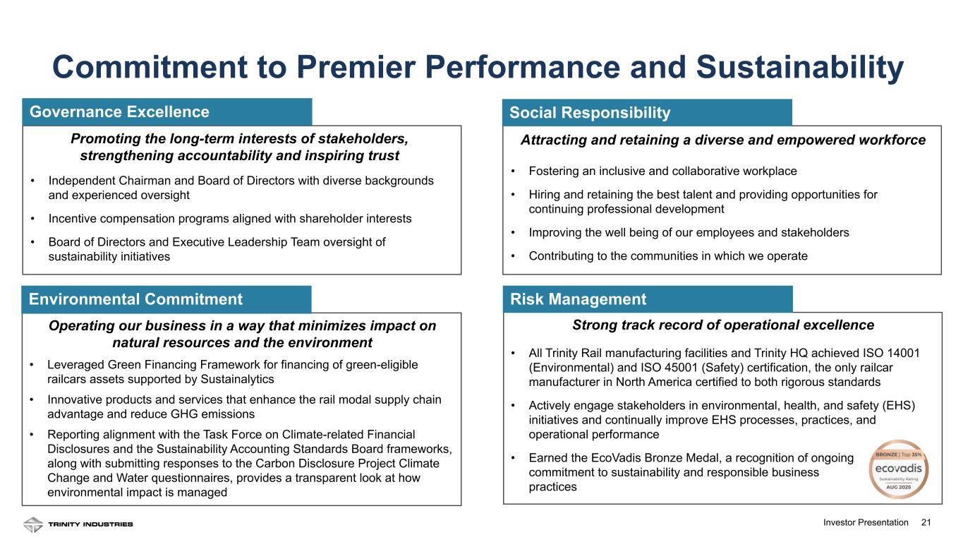 20Investor Presentation 13% 9% 4% 24% 12% 23% TRN, 15% TRN GATX UnionTank All other * Infinity ITE CIT The TrinityRail platform has grown at a 10% CAGR since 2003 Lessors Make Up A Growing Share of the North American Fleet Railcar Lessor Ownership Profile Presents Consolidation Opportunity Operating Lessors *Over 85 lessors own 228K railcars in “All other” 20 Financial Lessors 55% 18% 17% 10% Lessor Railroad Shipper TTX See appendix for source information Capitalizing on Structural Change in the Rail Market
