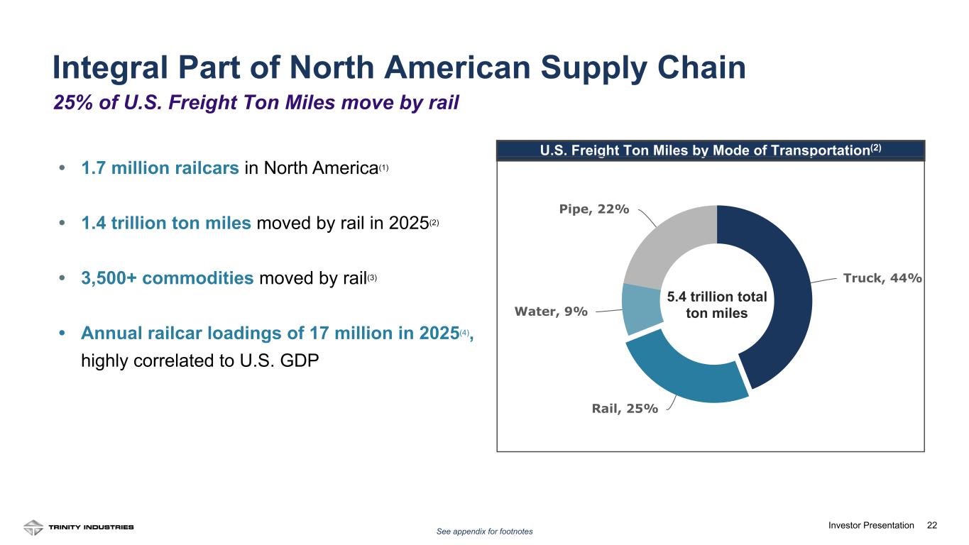 21Investor Presentation Promoting the long-term interests of stakeholders, strengthening accountability and inspiring trust • Independent Chairman and Board of Directors with diverse backgrounds and experienced oversight • Incentive compensation programs aligned with shareholder interests • Board of Directors and Executive Leadership Team oversight of sustainability initiatives Attracting and retaining a diverse and empowered workforce • Fostering an inclusive and collaborative workplace • Hiring and retaining the best talent and providing opportunities for continuing professional development • Improving the well being of our employees and stakeholders • Contributing to the communities in which we operate Operating our business in a way that minimizes impact on natural resources and the environment • Leveraged Green Financing Framework for financing of green-eligible railcars assets supported by Sustainalytics • Innovative products and services that enhance the rail modal supply chain advantage and reduce GHG emissions • Reporting alignment with the Task Force on Climate-related Financial Disclosures and the Sustainability Accounting Standards Board frameworks, along with submitting responses to the Carbon Disclosure Project Climate Change and Water questionnaires, provides a transparent look at how environmental impact is managed Strong track record of operational excellence • All Trinity Rail manufacturing facilities and Trinity HQ achieved ISO 14001 (Environmental) and ISO 45001 (Safety) certification, the only railcar manufacturer in North America certified to both rigorous standards • Actively engage stakeholders in environmental, health, and safety (EHS) initiatives and continually improve EHS processes, practices, and operational performance • Earned the EcoVadis Bronze Medal, a recognition of ongoing commitment to sustainability and responsible business practices Commitment to Premier Performance and Sustainability Governance Excellence Social Responsibility Environmental Commitment Risk Management