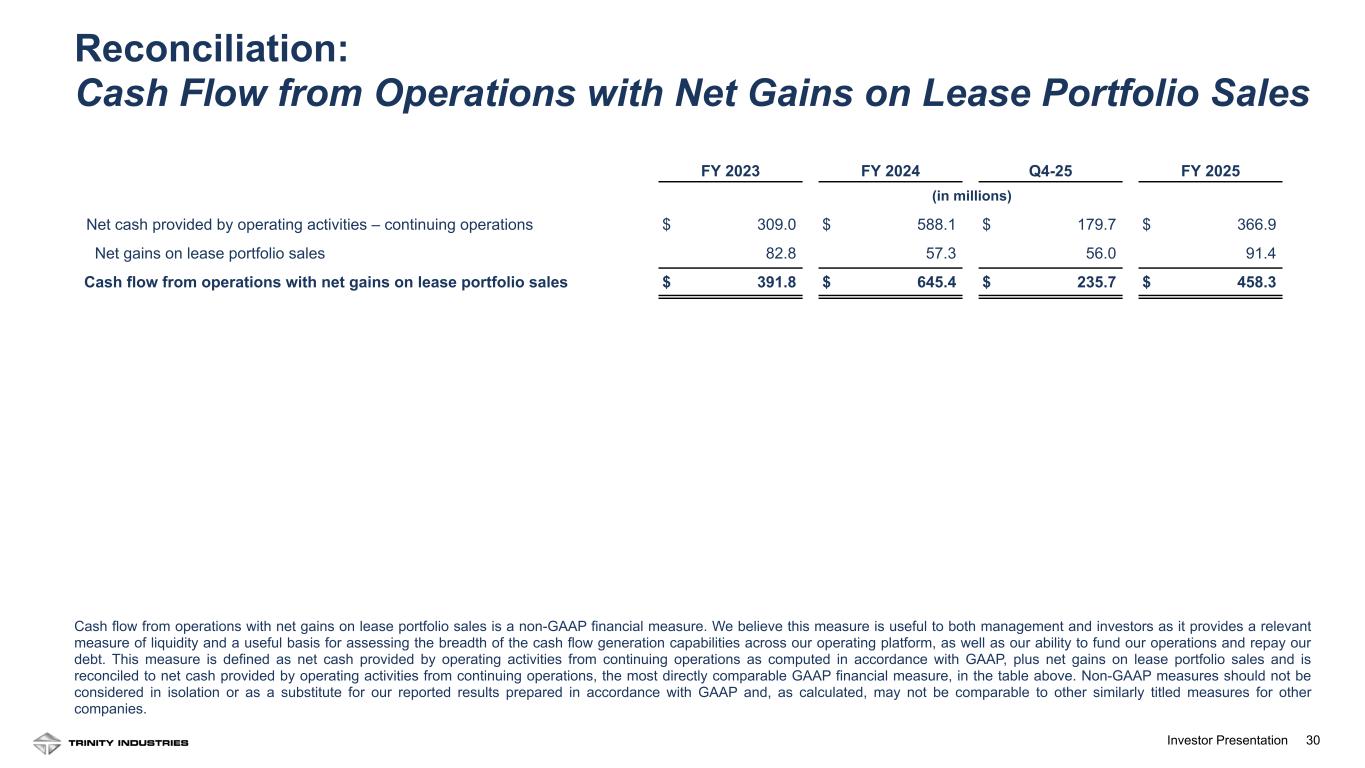 29Investor Presentation 29 (1) Represents the change in estimated fair value of additional contingent consideration associated with an acquisition. (2) Represents insurance recoveries in excess of net book value for assets damaged by a tornado at the Company’s rail maintenance facility in Cartersville, Georgia in the first quarter of 2021. (3) Represents interest income accretion related to a seller-financing agreement associated with the sale of certain non-operating assets. We have supplemented the presentation of our reported GAAP operating profit, income from continuing operations before income taxes, provision (benefit) for income taxes, income from continuing operations, net income from continuing operations attributable to Trinity Industries, Inc., and diluted income from continuing operations per common share attributable to Trinity Industries, Inc. with non-GAAP measures that adjust the GAAP measures to exclude the impact of certain selling, engineering, and administrative expenses; gains on dispositions of other property; restructuring activities, net; interest expense, net; and certain other transactions or events (as applicable), described in the footnotes to the table above. These non-GAAP measures are derived from amounts included in our GAAP financial statements and are reconciled to the most directly comparable GAAP financial measures in the table above. Management believes that these measures are useful to both management and investors for analyzing the performance of our business without the impact of certain items that are not indicative of our normal business operations. Non-GAAP measures should not be considered in isolation or as a substitute for our reported results prepared in accordance with GAAP and, as calculated, may not be comparable to other similarly titled measures for other companies. Year Ended December 31, 2023 (in millions, except per share amounts) GAAP Selling, engineering, and administrative expenses (1) Gains on dispositions of property – other (2) Restructuring activities, net Interest expense, net (3) Adjusted Operating profit $ 417.0 $ 4.0 $ (6.3) $ (2.2) $ — $ 412.5 Income from continuing operations before income taxes $ 149.0 $ 4.0 $ (6.3) $ (2.2) $ (1.5) $ 143.0 Provision (benefit) for income taxes $ 9.0 $ 1.0 $ (1.6) $ (0.6) $ (0.4) $ 7.4 Income from continuing operations $ 140.0 $ 3.0 $ (4.7) $ (1.6) $ (1.1) $ 135.6 Net income from continuing operations attributable to Trinity Industries, Inc. $ 119.4 $ 3.0 $ (4.7) $ (1.6) $ (1.1) $ 115.0 Diluted weighted average shares outstanding 83.4 83.4 Diluted income from continuing operations per common share attributable to Trinity Industries, Inc. $ 1.43 $ 1.38 Reconciliation: Adjusted Operating Results