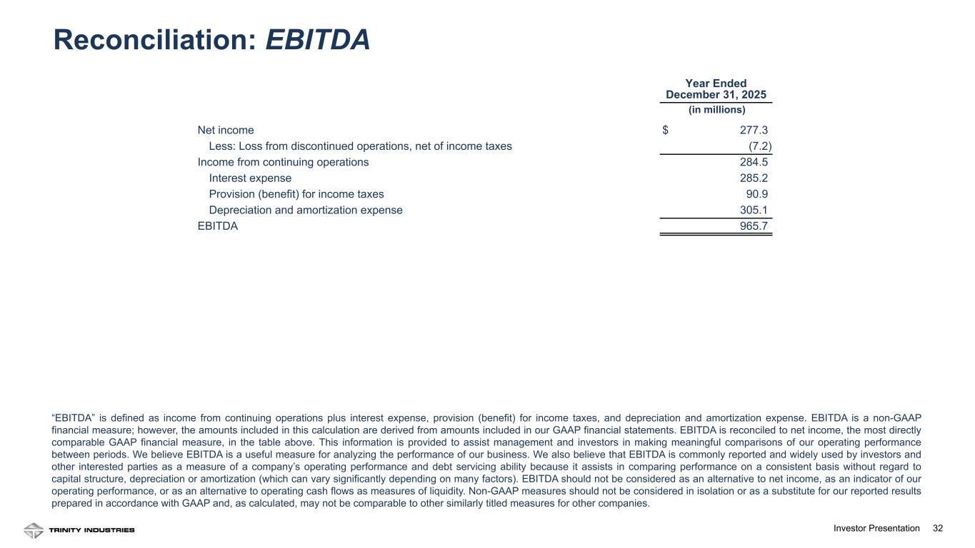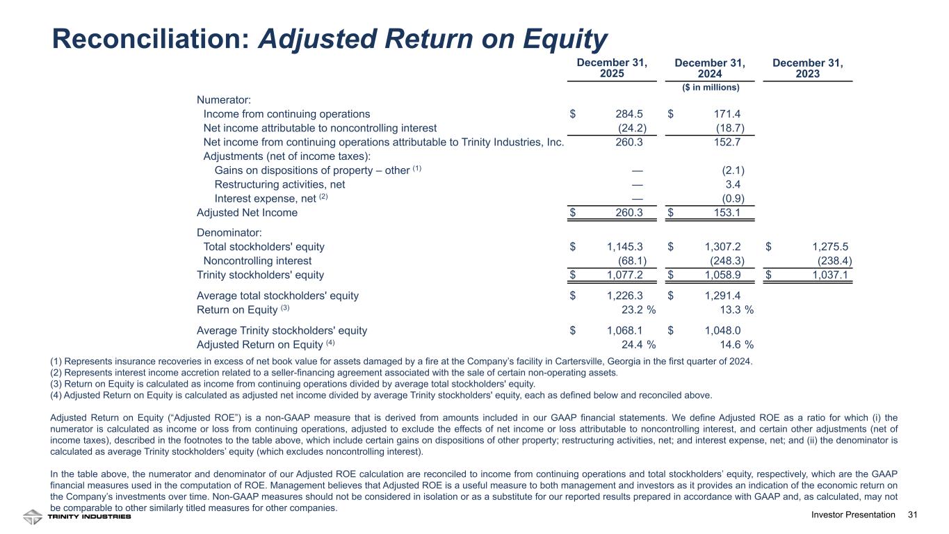 31Investor Presentation (1) Represents insurance recoveries in excess of net book value for assets damaged by a fire at the Company’s facility in Cartersville, Georgia in the first quarter of 2024. (2) Represents interest income accretion related to a seller-financing agreement associated with the sale of certain non-operating assets. (3) Return on Equity is calculated as income from continuing operations divided by average total stockholders' equity. (4) Adjusted Return on Equity is calculated as adjusted net income divided by average Trinity stockholders' equity, each as defined below and reconciled above. Adjusted Return on Equity (“Adjusted ROE”) is a non-GAAP measure that is derived from amounts included in our GAAP financial statements. We define Adjusted ROE as a ratio for which (i) the numerator is calculated as income or loss from continuing operations, adjusted to exclude the effects of net income or loss attributable to noncontrolling interest, and certain other adjustments (net of income taxes), described in the footnotes to the table above, which include certain gains on dispositions of other property; restructuring activities, net; and interest expense, net; and (ii) the denominator is calculated as average Trinity stockholders’ equity (which excludes noncontrolling interest). In the table above, the numerator and denominator of our Adjusted ROE calculation are reconciled to income from continuing operations and total stockholders’ equity, respectively, which are the GAAP financial measures used in the computation of ROE. Management believes that Adjusted ROE is a useful measure to both management and investors as it provides an indication of the economic return on the Company’s investments over time. Non-GAAP measures should not be considered in isolation or as a substitute for our reported results prepared in accordance with GAAP and, as calculated, may not be comparable to other similarly titled measures for other companies. December 31, 2025 December 31, 2024 December 31, 2023 ($ in millions) Numerator: Income from continuing operations $ 284.5 $ 171.4 Net income attributable to noncontrolling interest (24.2) (18.7) Net income from continuing operations attributable to Trinity Industries, Inc. 260.3 152.7 Adjustments (net of income taxes): Gains on dispositions of property – other (1) — (2.1) Restructuring activities, net — 3.4 Interest expense, net (2) — (0.9) Adjusted Net Income $ 260.3 $ 153.1 Denominator: Total stockholders' equity $ 1,145.3 $ 1,307.2 $ 1,275.5 Noncontrolling interest (68.1) (248.3) (238.4) Trinity stockholders' equity $ 1,077.2 $ 1,058.9 $ 1,037.1 Average total stockholders' equity $ 1,226.3 $ 1,291.4 Return on Equity (3) 23.2 % 13.3 % Average Trinity stockholders' equity $ 1,068.1 $ 1,048.0 Adjusted Return on Equity (4) 24.4 % 14.6 % Reconciliation: Adjusted Return on Equity